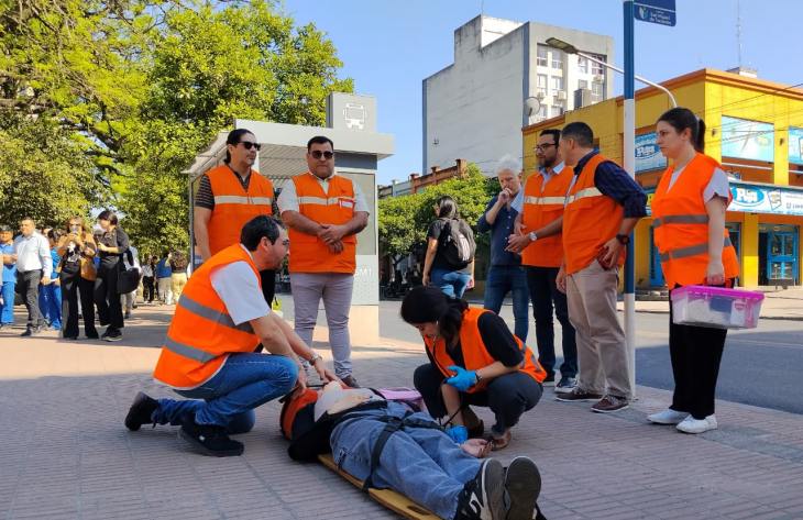 En el inicio del simulacro, los bomberos y los integrantes de Defensa Civil ingresaron al edificio del Subsidio de Salud, ubicado en calles Las Piedras y 9 de Julio, en el centro capitalino, para evacuar a las personas y rescatar a las víctimas, quienes eran trasladadas a la plaza Yrigoyen donde se había montado el centro de asistencia por parte de los médicos del Siprosa junto a las ambulancias del 107.